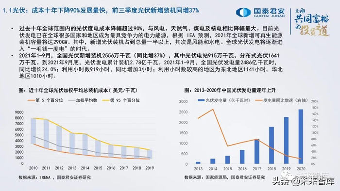 2021年1-9月,全国光伏新增装机2556万千瓦(同比增37%),其中光伏电站915万千瓦、分布式光伏1641万千瓦。到2021年9月底,光伏发电累计装机2.78亿千瓦。2021年1-9月,全国光伏发电量2486亿千瓦时,同比增长24.0%;利用小时数919小时,同比增加3小时;利用小时数较高的地区为东北地区1141小时,华北地区1010小时。