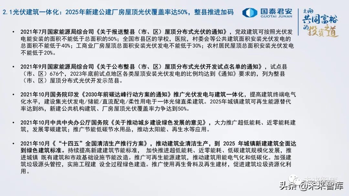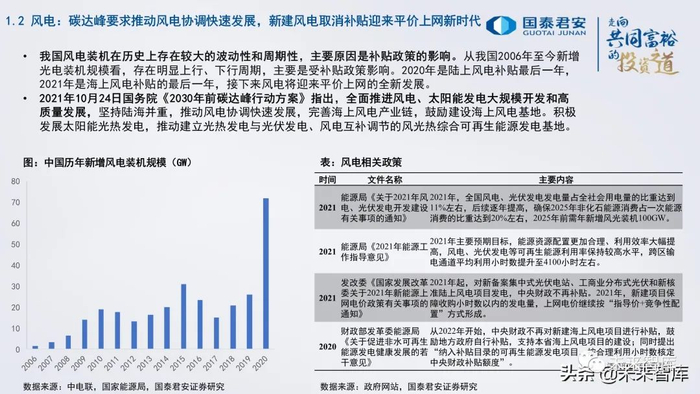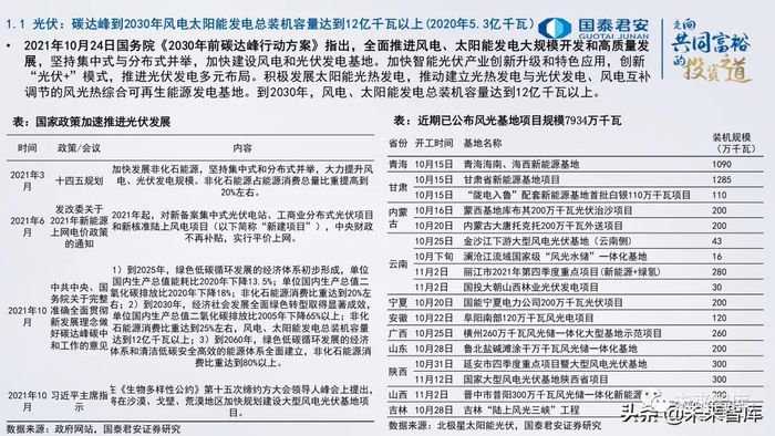 2021年10月24日国务院《2030年前碳达峰行动方案》指出,全面推进风电、太阳能发电大规模开发和高质量发展,坚持集中式与分布式并举,加快建设风电和光伏发电基地。加快智能光伏产业创新升级和特色应用,创新“光伏+”模式,推进光伏发电多元布局。积极发展太阳能光热发电,推动建立光热发电与光伏发电、风电互补调节的风光热综合可再生能源发电基地。到2030年,风电、太阳能发电总装机容量达到12亿千瓦以上。