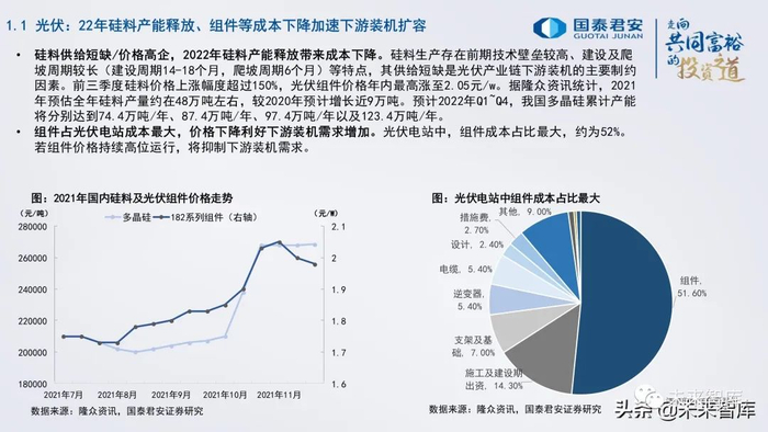 组件占光伏电站成本最大,价格下降利好下游装机需求增加。光伏电站中,组件成本占比最大,约为52%。若组件价格持续高位运行,将抑制下游装机需求。