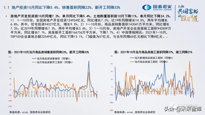 房地产开发投资前10月同增7.2%、单月同比下降5.4%。土地购置面积前10月下降11%、单月同比下降24.2%。1) 1—10月份,全国房地产开发投资124934亿元,同比增长7.2%;比19年同期增长14.0%,两年平均增长6.8%。其中,住宅投资94327亿元,增长9.3%。2)1—10月份,商品房销售面积143041万平方米,同比增长7.3%;比2019年同期增长7.3%,两年平均增长3.6%。3)1—10月份,房地产开发企业房屋施工面积942859万平方米,同比增长7.1%。房屋新开工面积166736万平方米,下降7.7%。