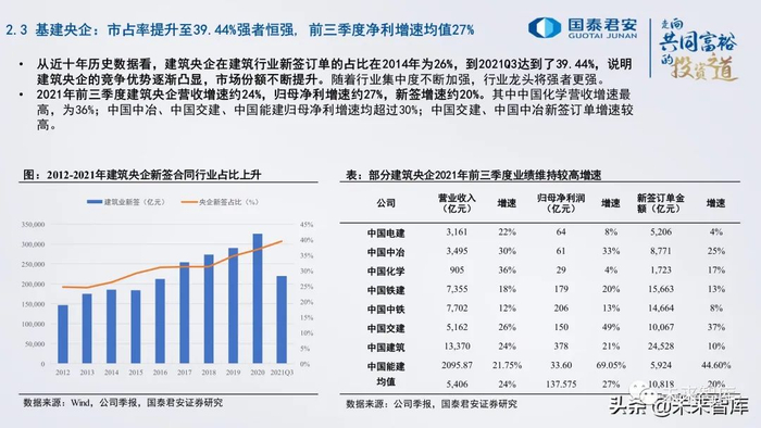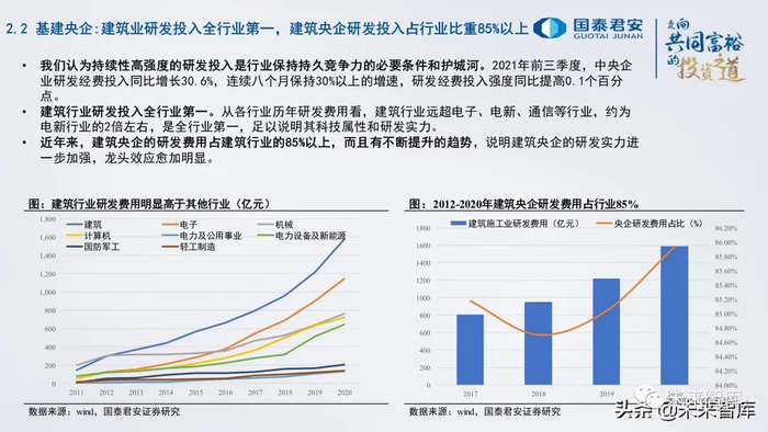 近年来,建筑央企的研发费用占建筑行业的85%以上,而且有不断提升的趋势,说明建筑央企的研发实力进一步加强,龙头效应愈加明显。