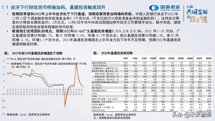 预期四季度和2022年上半年经济处于下行通道,预期政策将更加明确和积极。中国人民银行决定于2021年12月15日下调金融机构存款准备金率0.5个百分点(不含已执行5%存款准备金率的金融机构)。这样此次降准共计释放长期资金约1.2万亿元。12月6日中共中央政治局指出明年经济工作要稳字当头、稳中求进,继续实施积极的财政政策和稳健的货币政策。