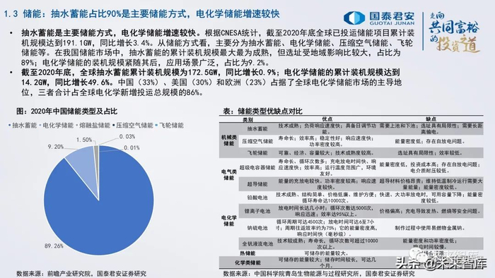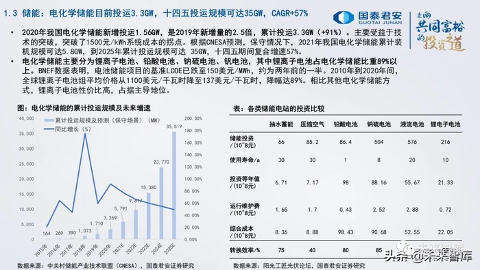 2020年我国电化学储能新增投运1.56GW,是2019年新增量的2.5倍,累计投运3.3GW(+91%)。主要受益于技术的突破,突破了1500元/kWh系统成本的拐点。根据CNESA预测,保守情况下,2021年我国电化学储能累计装机规模可达5.8GW,到2025年累计投运规模可达 35GW,十四五期间复合增速57%。