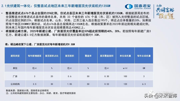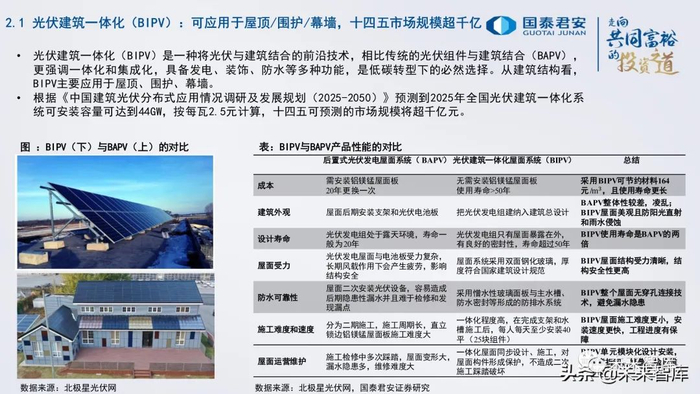 根据《中国建筑光伏分布式应用情况调研及发展规划(2025-2050)》预测到2025年全国光伏建筑一体化系统可安装容量可达到44GW,按每瓦2.5元计算,十四五可预测的市场规模将超千亿元。