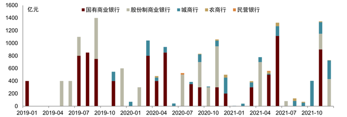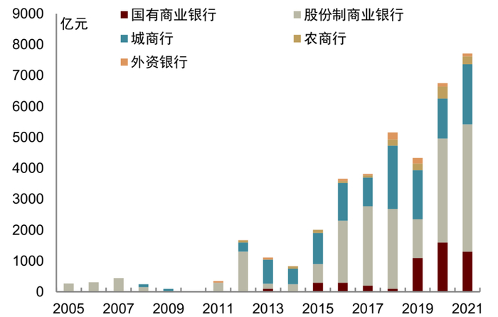 永续债方面,2019年1月25日发行的“19中国银行永续债01”为首支银行永续债。2019-2021年,银行永续债的发行支数分别为16支、54支和63支,发行金额分别为5696亿元、6484亿元和5855亿元。由于目前银行永续债的发行期限均为5+N,尚未有银行永续债面临赎回。
