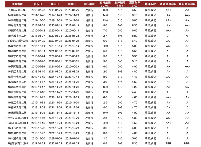 从损失吸收条款来看,除了“16廊坊银行二级”和“20渣打二级资本债01”由于是私募发行、条款披露不明晰以外,其余公募发行的二级资本债均为减记型二级资本债。