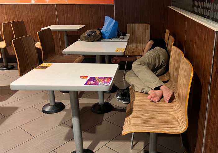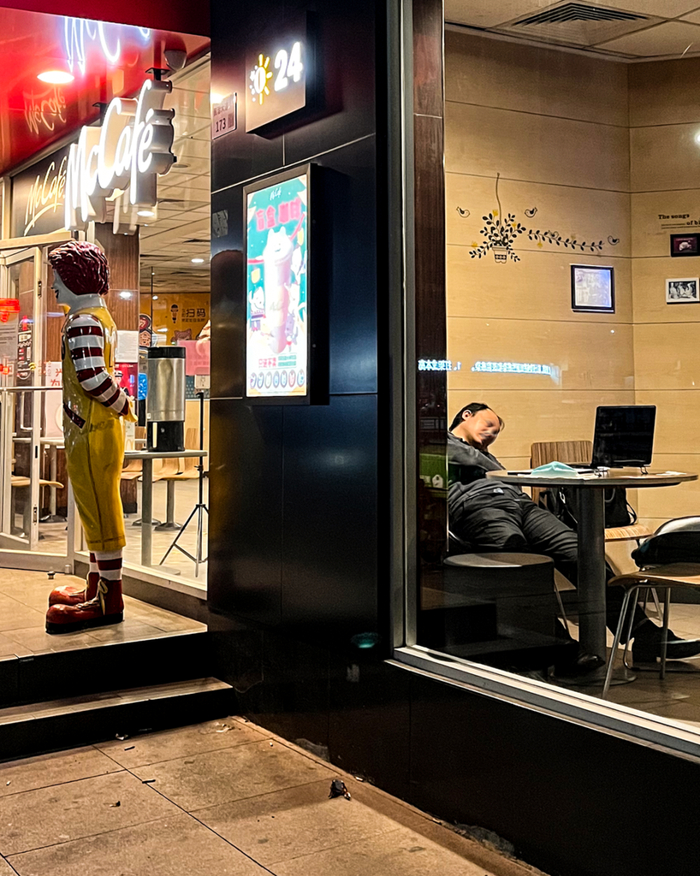十几天前的一个夜里,我在民治的麦当劳,见到中年男人Z,他侧躺在几张硬板凳上睡着了,赤脚很干净,眼镜、外套和手提袋放在小桌上。