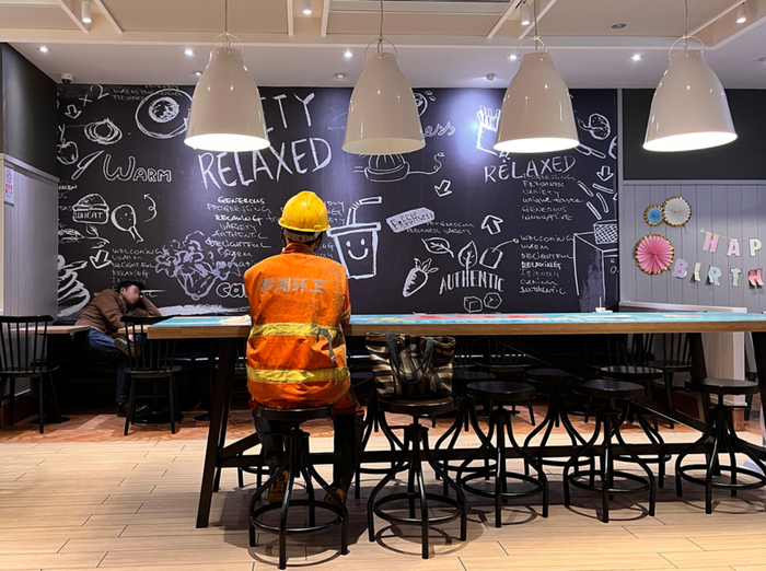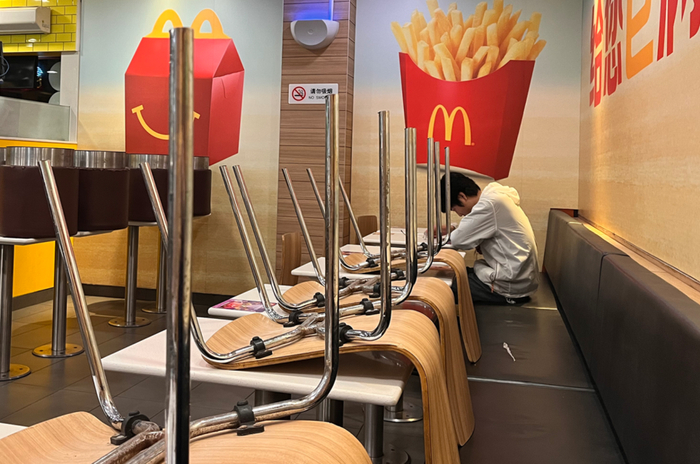 这是深圳冬夜少有的台风天,凄风卷着细雨,刮到身上湿冷难耐。21日凌晨1点,当我再次走进这家麦当劳时,店内人少得可怜,白色灯光下散发着静默的气息, 店员们的动作似乎也轻手轻脚起来。