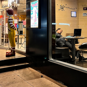 某个凌晨在福田,我也碰到过一个流浪女人,她看起来有60多岁,用帽子和毛巾把头裹得严严实实,随身背着枕头与塑料饭盒,在麦当劳门口来回徘徊,犹犹疑疑地看着店内,始终没有推门。
