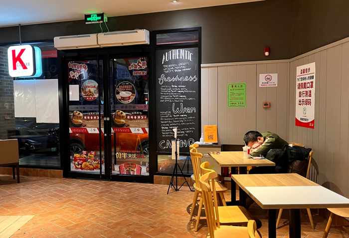来到肯德基后,她又选了个靠墙的长椅,把双腿平放在椅面上,伸手将乱糟糟头发的扎好,从面容来看她应该只有40多岁。与她隔着一个座位的中年男人,刚醒来不久,在她落座之后迅速离开了。