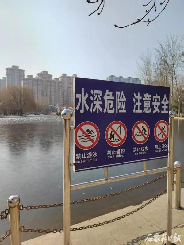 1月3日,救人事件已过去一天,记者在绿洲公园的湖边看到,虽然湖面已经结了大块的冰,但冰层薄厚不均,靠近岸边的多处薄冰上还有化开的水。湖的北岸、南岸都竖着“水深危险,注意安全”的警示牌,一些孩子在湖边跑来跑去,有几个孩子越过栏杆拿着小锤子在凿冰玩耍,家长则在一边看手机。