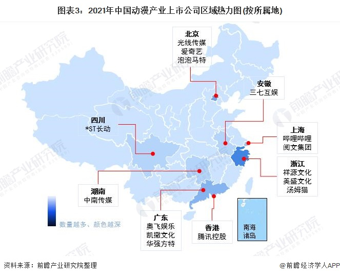 动漫产业的发展与区域经济水平和文化消费水平息息相关。从区域分布来看,我国动漫上市企业较多的省份包括北京、上海、浙江、广东等,均位于经济发达的东部地区,文化消费环境较佳,居民文化消费意愿较强。