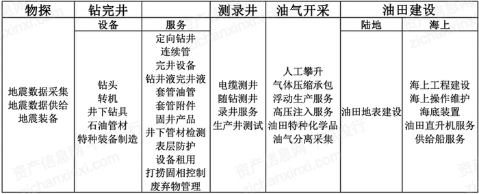 油服行业是由石油勘探生产所形成的为石油公司提供工程技术服务的行业。行业体系规模庞大,服务贯穿石油勘探、开发、生产的油田整体价值产业链。油气设备行业主要指生产商为油气服务过程中提供所需设备的行业,其中主要是指各种用于勘探开发和生产环节的机械设备等。