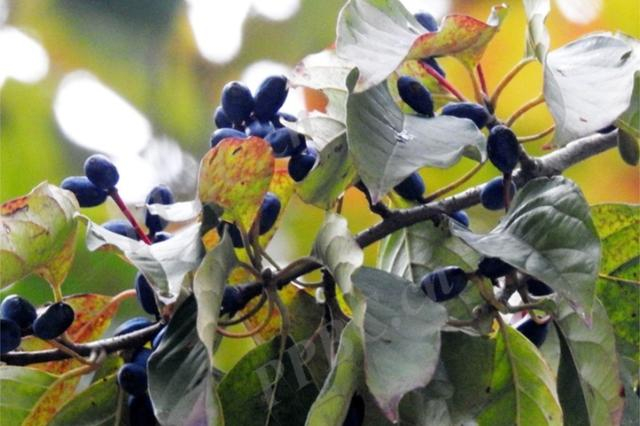 蓝果树,蓝果树科蓝果树属植物,树皮淡褐色或深灰色,常裂成薄片脱落;花单性,雄花着生于叶已脱落的老枝上,雌花生于具叶的幼枝上。核果,幼时紫绿色,成熟时深蓝色,后变深褐色。花期4月下旬,果期9月。该种木材坚硬,供建筑和制舟车、家具等用,或作枕木、造纸原料。树干通直,树冠呈宝塔形,枝叶茂密,秋叶红艳,色彩美观。
