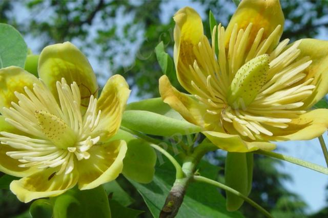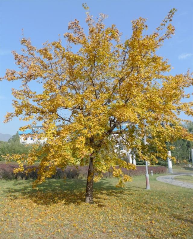 杂交鹅掌楸,木兰科鹅掌楸属植物,以中国鹅掌楸为母本、北美鹅掌楸为父本获得的人工杂交种。叶片形似马褂,所以也称为杂交马褂木。花期5-6月,花较大,黄色,具清香,单生枝顶,形似郁金香,所以又被称为“木本郁金香”;聚合果纺锤形,10月成熟。具有抗烟尘、抗二氧化硫等特性。杂种鹅掌楸可孤植于草坪间给人以幽静、祥和感;可群植于绿林,或做行道树。夏季枝繁叶茂、冠大浓郁、绿荫如盖,秋季叶变金黄,冬季落叶迟,是不可多得的彩叶树种。