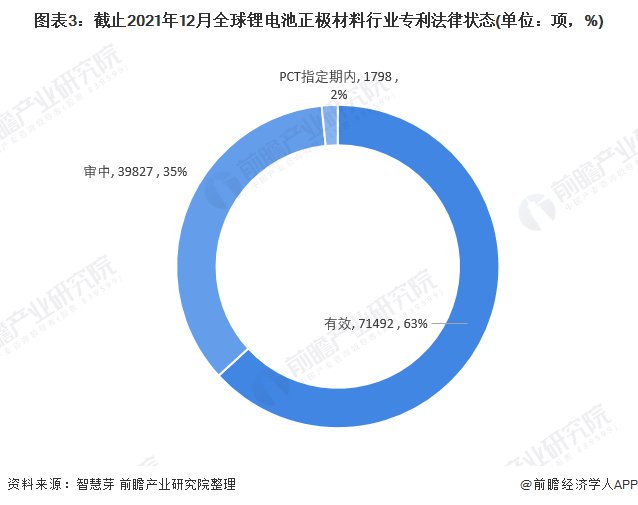 截止2021年12月20日,全球锂电池正极材料大多数专利处于“有效”和“审中”状态,两者锂电池正极材料专利总量分别为7.15万项和3.98万项,分别占全球锂电池正极材料专利总量的63%和35%。PCT制定期内的锂电池正极材料专利数量为1798项,占全球锂电池正极材料专利总量的2%左右。