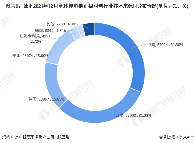 截止2021年12月20日,中国、日本、韩国及美国四大国的锂电池正极材料专利申请量占据全球总量的90%以上,其中,中国和日本的占比最大,分别达到31.30%和31.29%。