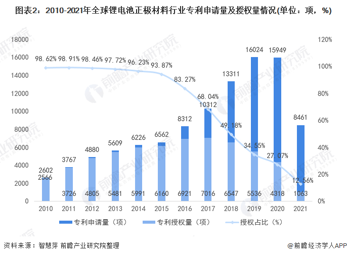 2021年全球锂电池正极材料行业专利申请数量和专利授权数量分别为8461项和1063项,授权占比仅为12.56%。