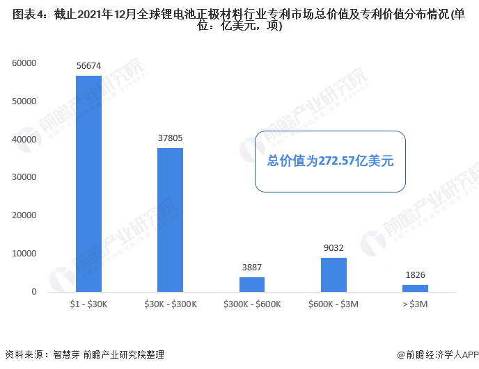 截止2021年12月20日,全球锂电池正极材料行业专利总价值为272.57亿美元。其中,3万美元以下的锂电池正极材料专利申请数量最多,为5.67万项;其次是3万-30万美元的锂电池正极材料专利,合计专利申请量约为3.78万项。超过300万美元的锂电池正极材料专利申请数量最少,仅为1826项。