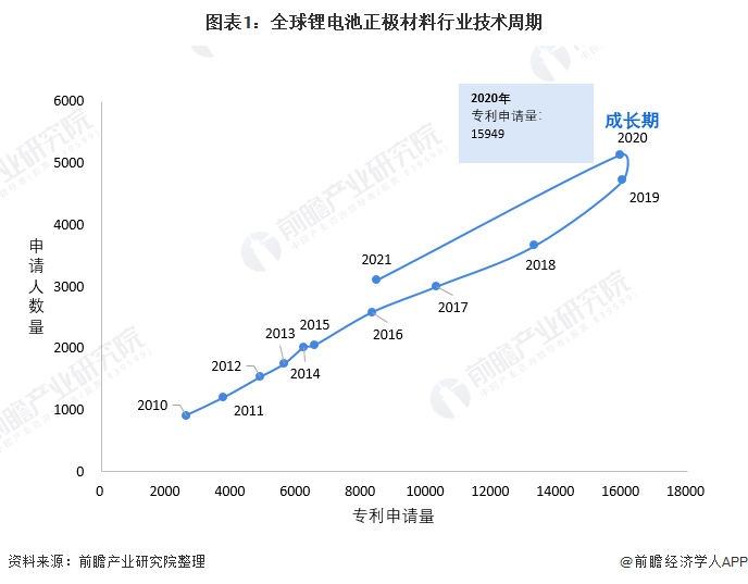 2010-2020年,全球锂电池正极材料行业专利申请人数量及专利申请量均呈现高速增长态势,2020年,全球锂电池正极材料行业专利申请人数量及专利申请量分别达到8461人及15949项,均处于较高水平。整体来看,全球锂电池正极材料技术处于成长期。