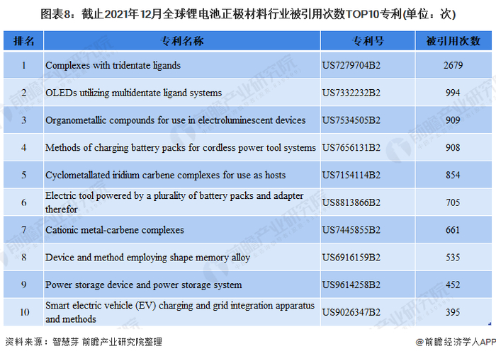 被引用次数最多的专利均为国外专利,其中专利号为US7279704B2的“Complexes with tridentate ligands”专利被引用次数高达2679次,位列全球首位。其它被引用次数前十大专利如下所示: