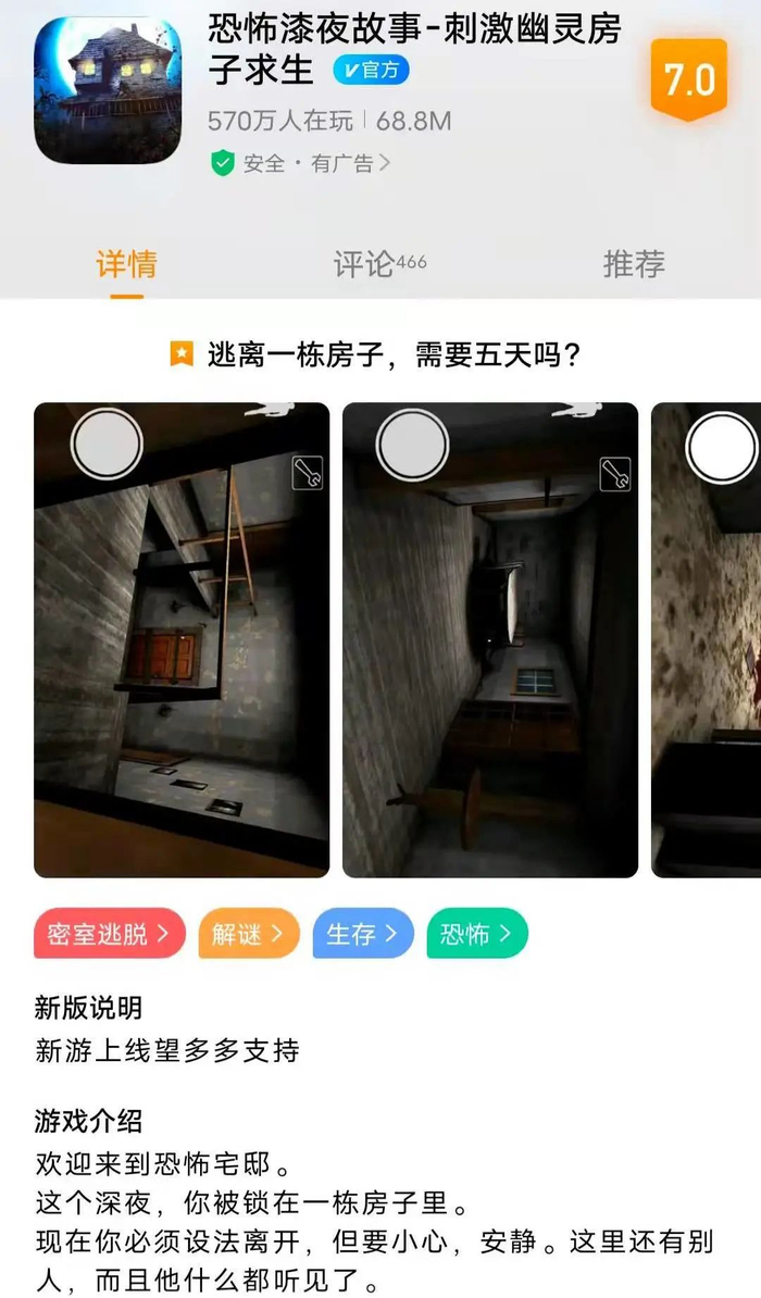 游戏首页有适龄提示,但并未找到具体说明。而一款具有恐怖元素的游戏适龄提示竟然为“3+”,对此,商店客服人员表示,是游戏厂商策划自行标注设定,平台无法干预。