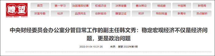 《瞭望》新闻周刊2022年第1期刊发中央财经委员会办公室分管日常工作的副主任韩文秀所撰文章,文章称,各地区各部门都要担负起稳定宏观经济的责任,这不仅是经济问题,更是政治问题。各方面要积极推出有利于经济稳定的政策,慎重出台有收缩效应的政策,政策发力要适当靠前,努力实现2022年经济平稳开局、向好发展。