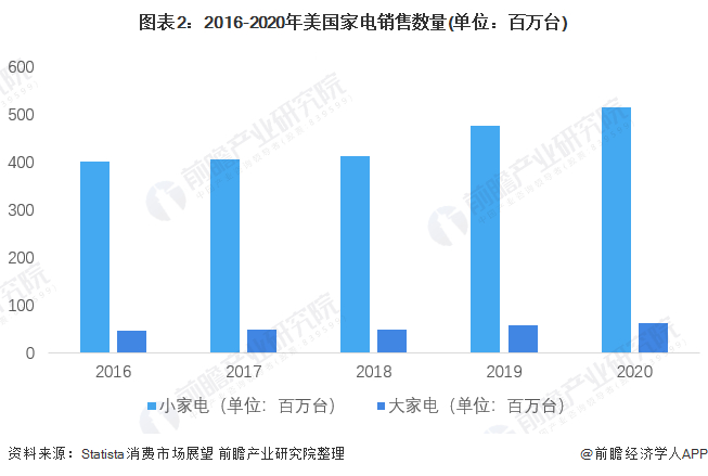 根据Statista消费市场展望中提供的数据,2016-2020年美国家电销售数量呈不断上升趋势,按品类来分,小家电的销售数量远多于大家电。2020年,美国小家电的销售数量为514.1百万台,大家电的销售数量为62.7百万台。