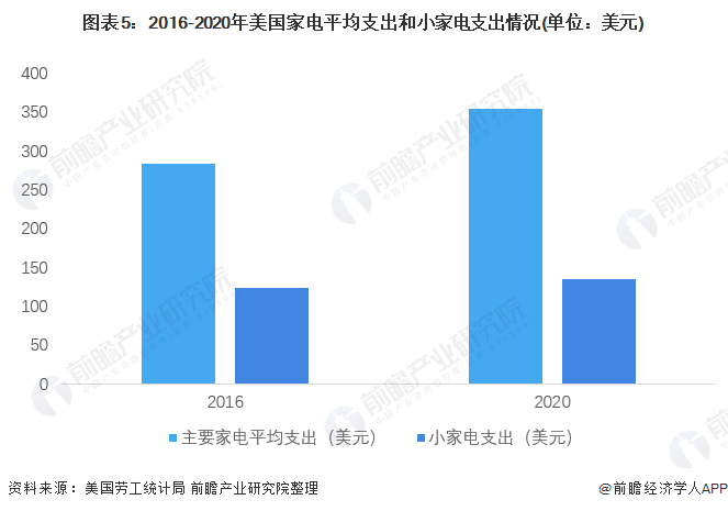 2016-2020年,美国家电平均支出呈不断上升趋势。根据美国劳工统计局披露的数据,2020年,美国主要家电平均支出为324美元,较2016年上升25%,美国小家电的支出为135美元,较2016年上升10%。