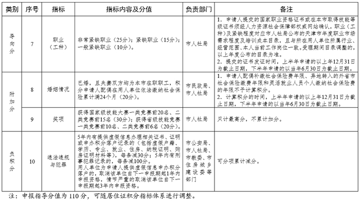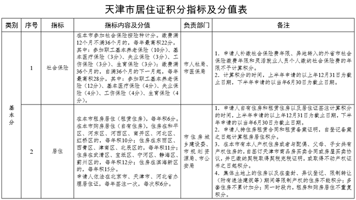 天津市居住证积分指标及分值表