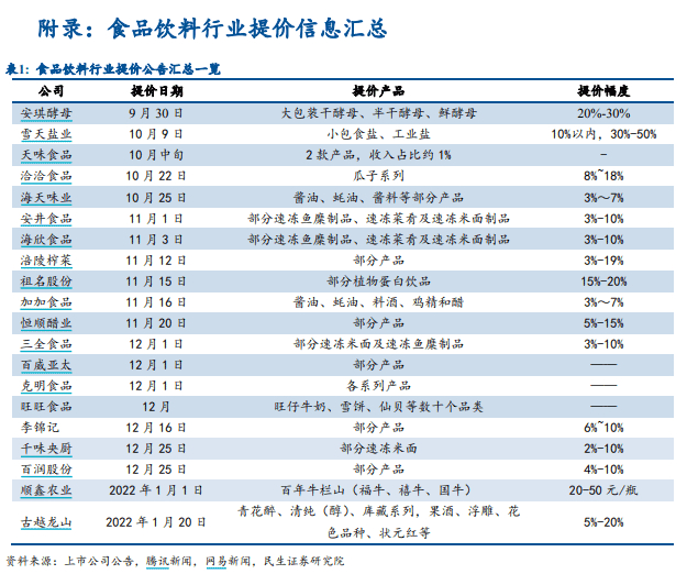 截至2021年末食品饮料企业提价情况。