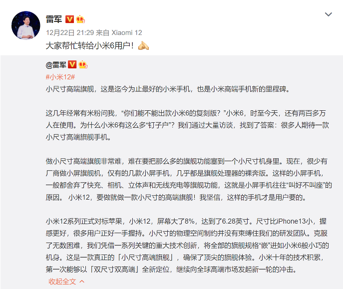 雷总微博中说到的,通过大量的对小米6用户的访谈得出,他们需要一款小尺寸的高端旗舰手机。发布会之后我特地去了几次小米之家,店员告诉我他们有一个很重要的任务就是询问来店的小米6用户,他们到底为什么不换手机?