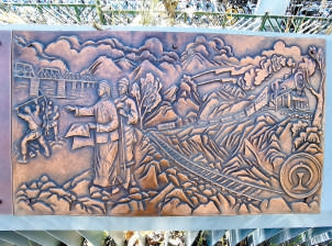 1907年3月,京门铁路正式动工。在京门铁路主题公园,有一幅浮雕再现了当年詹天佑带领工人修建京门铁路的场景。只见詹天佑深入一线,左手持工程图,右手认真指导技术人员开展施工,远处的工人们手拿铁镐钢凿修建路基,肩扛手抬铁轨枕木。他们逢山开路,遇水架桥,在修建过程中克服了一个又一个困难,创造了一个又一个奇迹。