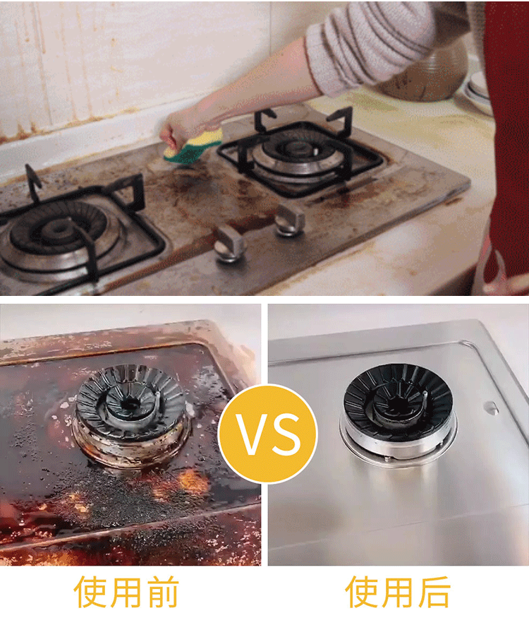布满油渍的台盆、碳化的煤气灶,涂上20秒就溶解,3分钟擦洗后,油垢尽除,厨具变得亮晶晶的,就像新的一样!