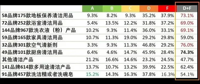 《EWG》报告还对9类2500多种家用清洁产品进行了测评,实验发现大量日常清洁剂都处在F等级以上!(D以上=会对人体造成危害)