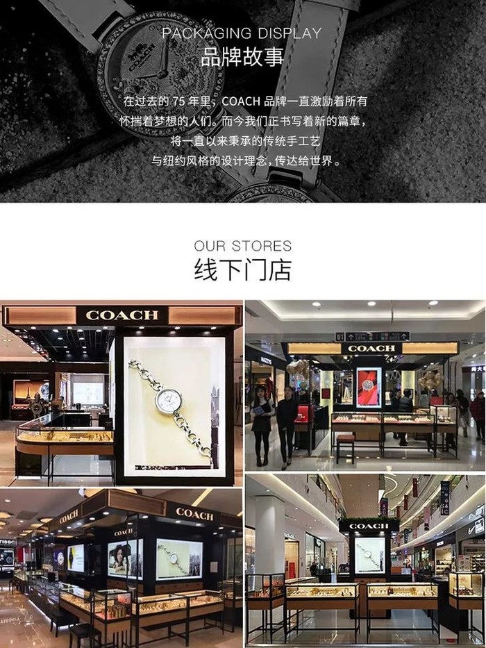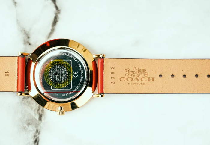 COACH手表表带和表盘背面都以雕刻技法清晰的打上了品牌logo、故事铭牌,低调中尽显奢华品质。