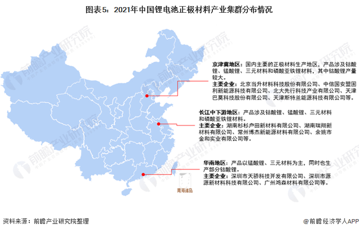 经过近十年的发展,国内锂电池正极材料行业已经形成了以京津地区、长江中下游地区和华南地区三大锂电池正极材料的产业基地。前瞻汇总中国三大锂电池正极材料产业基地主要特点、代表企业如下: