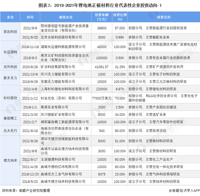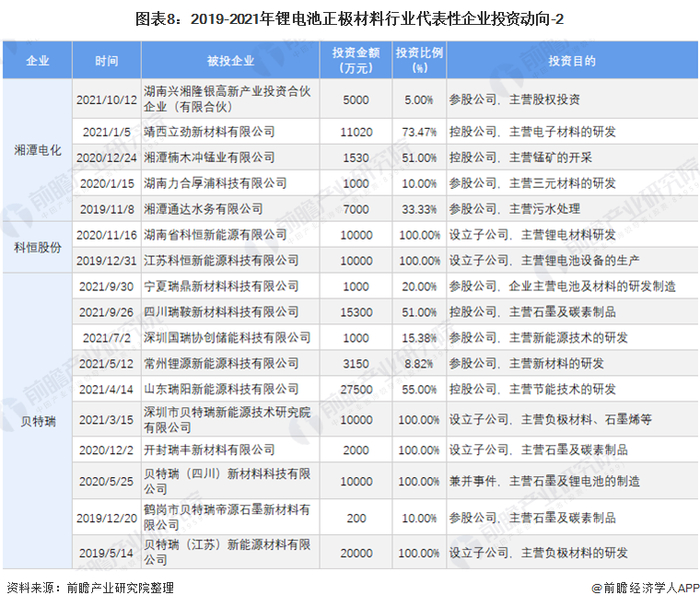 从投资事件来看,据不完全统计,2019-2021年,中国锂电池正极材料行业投资及兼并事件较多,且主要发生在行业龙头企业,企业投资目的主要主要集中在正极材料上游的原材料布局以及研发新型材料方面。2019-2021年,锂电池正极材料行业代表性企业投资事件汇总如下: