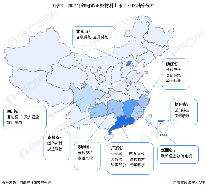 锂电池正极材料企业区域热力地图:我国锂电池正极材料企业多分布在京津冀及东南部等新能源市场发达地区