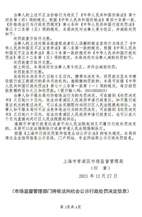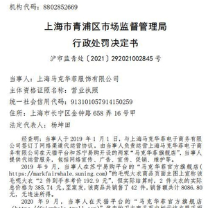 中国网财经1月6日讯(记者钟文鑫) 据上海市场监督管理局网站消息,上海马克华菲服饰有限公司(简称上海马克华菲)因利用虚假价格手段诱骗消费者交易、虚假宣传,被上海市青浦区市场监督管理局罚款3万元。