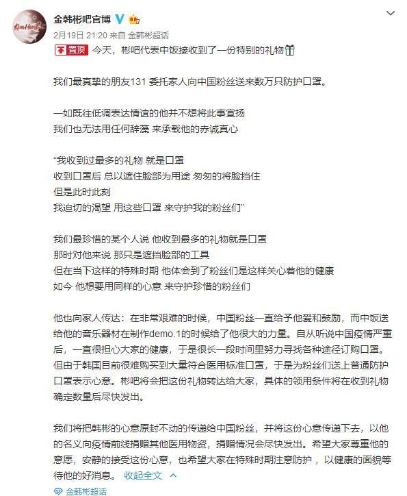 值得注意的是,2020年2月,金韩彬中国粉丝团@金韩彬吧官博(现更名为“金韩彬_WITHID”)称,金韩彬委托家人向中国粉丝送来数万只防护口罩。这也是众多粉丝在其吸毒被判后还不忍离去的原因之一。