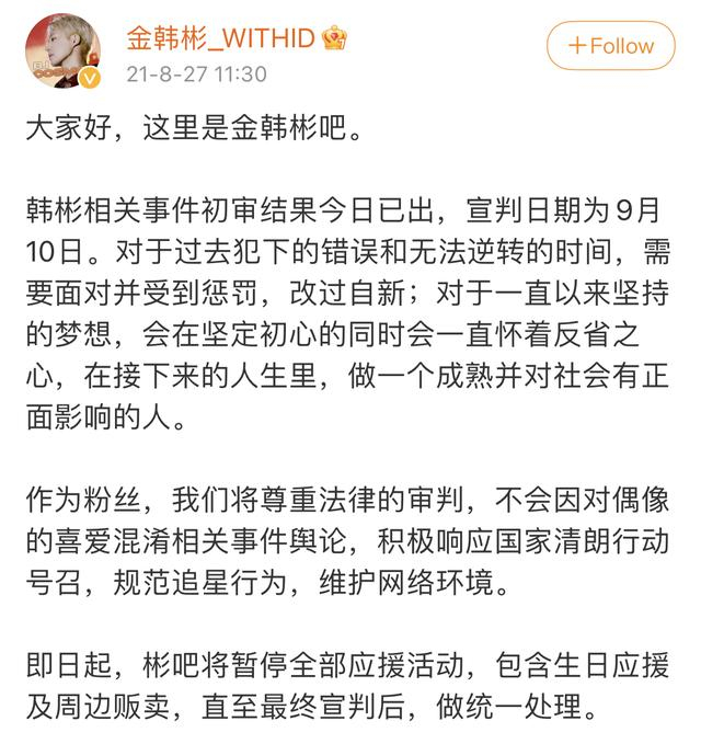 2021年8月27日,初审结果出炉后,@金韩彬吧官博(现更名为“金韩彬_WITHID”)曾发文称,“作为粉丝,我们将尊重法律的审判,不会因对偶像的喜爱混淆相关事件舆论,积极响应国家清朗行动号召,规范追星行为,维护网络环境”,并称暂停全部应援活动,直至9月10日宣判后做统一处理。