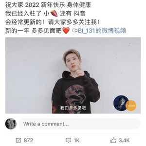 (观察者网讯)近日,有中国网友发现,去年9月因吸毒被判3年、缓期4年执行的韩国歌手B.I(本名金韩彬)继去年开通微博后,今年元旦一口气开通了小红书和抖音账号,并喊话中国粉丝“我们多多见吧”。然而,此番全面进军中国社交平台的势头,惹恼了不少中国网友。