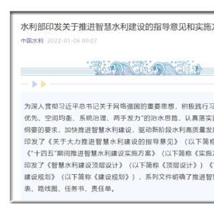 据中华人民共和国水利部官方微信公众号消息,近日,水利部印发了《关于大力推进智慧水利建设的指导意见》(以下简称《指导意见》)《“十四五”期间推进智慧水利建设实施方案》(以下简称《实施方案》),还同步印发了《智慧水利建设顶层设计》(以下简称《顶层设计》)《“十四五”智慧水利建设规划》(以下简称《建设规划》),系列文件明确了推进智慧水利建设的时间表、路线图、任务书、责任单。