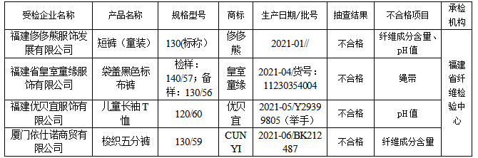 据公告,近期福建省市场监督管理局组织对儿童及婴幼儿服装产品质量开展省级监督抽查。本次共抽查51家生产企业生产的60批次产品,其中4批次不合格,不合格发现率为6.66%。不合格儿童及婴幼儿服装涉及“侈侈熊”“皇室童缘”“优贝宜”“CUNYI”等产品。