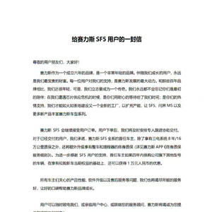 1月5日,针对赛力斯SF5“停产”风波,赛力斯发布了《给塞力斯SF5用户的一封信》。信中先是感谢用户对塞力斯这个新品牌的支持,然后指出,SF5会继续接受用户订单,“用户下单后,我们将即使安排专人跟进协助交付”。