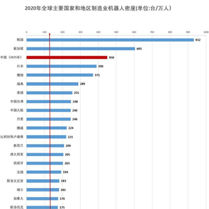 最近几年,中国机器人安装量显著增长,密度从2015年49个单位上升到2020年246个单位,排名从第25位上升至第9位,是全球机器人密度发展最具活力的国家。