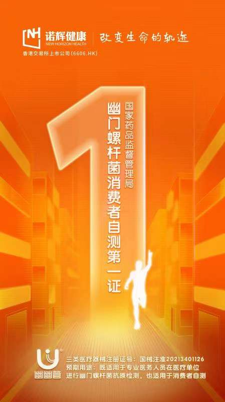 2022年1月6日,杭州 - 诺辉健康(6606.HK)宣布旗下幽门螺杆菌检测产品幽幽管®获得国家药品监督管理局(NMPA)批准的三类医疗器械注册申请。这是国家药监局批准的中国首个适用于“消费者自测”的幽门螺杆菌检测产品。