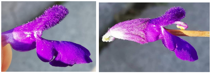 蜜蜂与鼠尾草之间的合作堪称完美,我们用一根细长的小木棍模拟蜜蜂,慢慢插入花冠筒底部“吸取花蜜”,注意此时隐藏在上唇瓣里的雄蕊,突然向下活动,打出花药,花粉洒在了木棍上,观察后发现鼠尾草的上唇瓣藏着2枚雄蕊和1个花柱,药隔很长,成为一个可以活动的杠杆,药隔的上臂连着花药,下臂和花丝组成一道把守花蜜的“门”,蜜蜂口器吸取花蜜时,会推开这扇“门”,相当于触发机关,药隔上臂的花药在杠杆作用下,打在了蜜蜂后背上。
