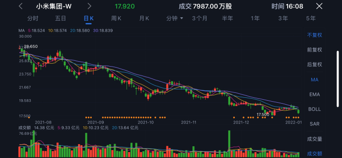 小米股价5日当天下跌3.45%,报收17.92港元。当天晚间,小米发布公告称,以每股17.92-18港元,回购272.5万股公司股份,耗资4896.77万港元。